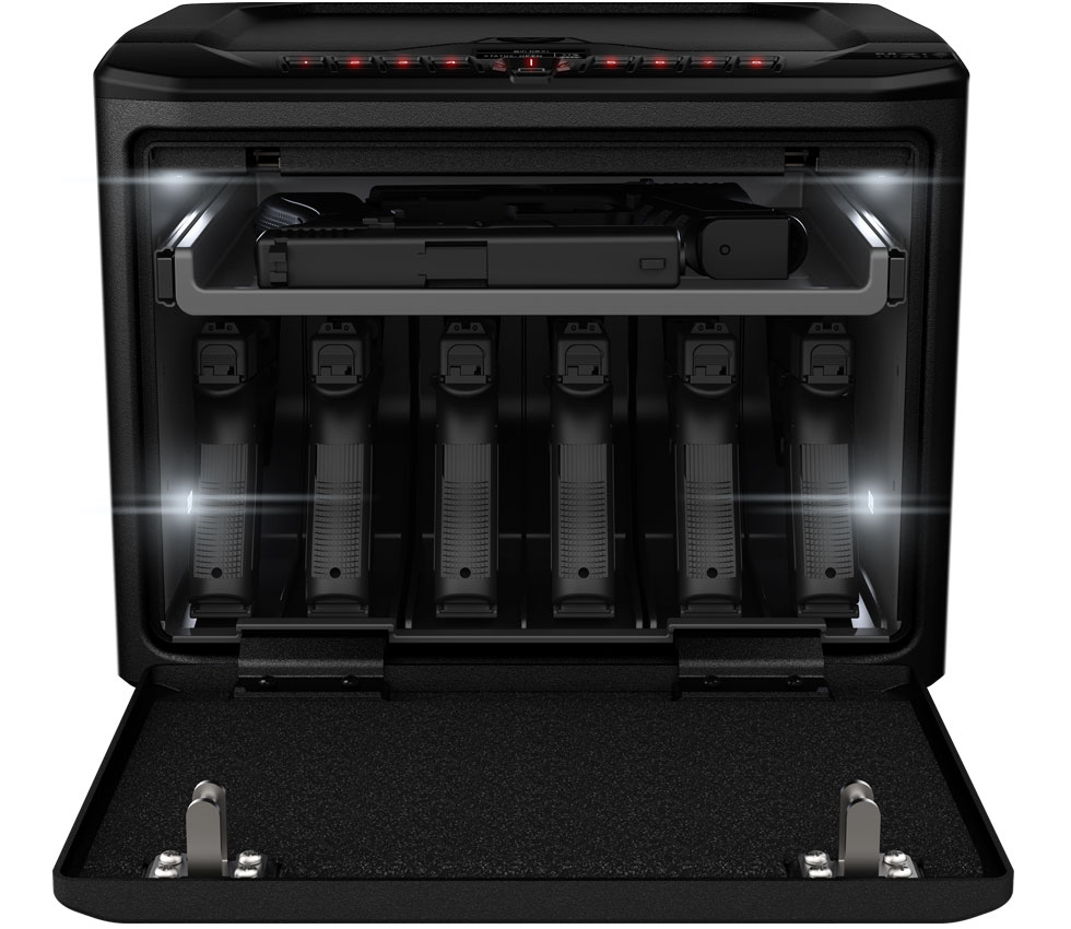 - Modular interior: features a pull out height adjustable shelf and includes (1) twin pistol rack. Customize your space and order additional accessories to store more handguns and magazines. Responsive LED lighting for full view of your safe contents with the adjustable brightness interior LED lights.