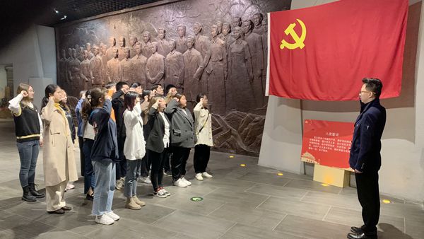 接下来参观了无锡市红色基地——无锡革命陈列馆。无锡革命陈列馆位于无锡博物院西区四楼,由《肩负民族复兴希望的无锡人》和《血与火的城市记忆--无锡革命简史》两个展馆组成。通过历史图片、实物资料及雕塑、油画等展品,大家详细了解了无锡在中国共产党领导下进行新民主主义革命的艰难曲折历程及13位无锡杰出人物在新民主主义革命和社会主义建设中的奋斗历程。先烈们前仆后继、迎难而上的革命精神深深地感染着大家。在先辈的见证下,学生党支部的师生代表,面对鲜红的党旗,坚定地举起右手,用心重温了入党初心。