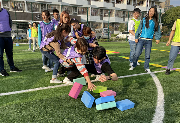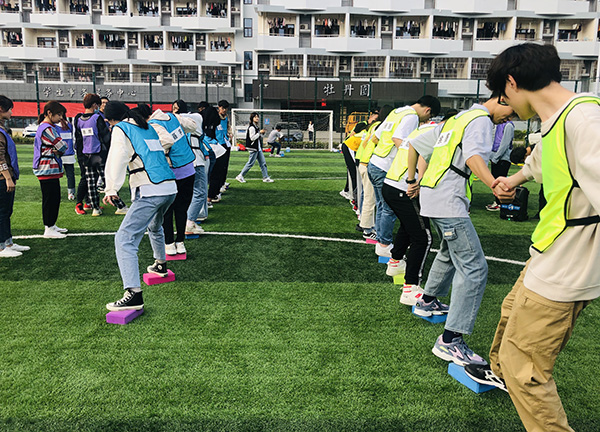 素质拓展分为准备活动、团辅活动、交流分享三个环节。在工作人员的带领下,同学们完成准备活动之后,展开了“前方有难后方支援”“千人过河”“指压板借力挑战赛”“撕名牌”四个团辅项目。“前方有难后方支援”环节主要考验同学们的反应能力和奉献精神,有助于增强团队凝聚力;“千人过河”主要考验同学们的团队协作能力及统筹安排技巧;“撕名牌”则展示出团队合作能力、协调能力、应变能力。