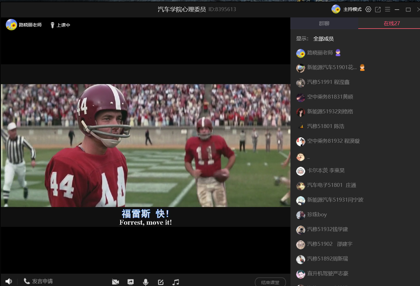 活动采用QQ课堂+在线讨论的形式进行。首先,通过线上屏幕分享,同学们一起观看经典影片《阿甘正传》。同学们被影片中主人公鲜明的性格特征吸引,为阿甘的离奇经历惊叹不已,为阿甘坚持目标的执着精神感染。影片结束后,同学们在小组内展开了激烈讨论,踊跃发表感想。周新瑞同学认为“生命的存在形式是由自己谱写的,但这需要你拥有达成目标的信念”。许佳旗感悟“对生命而言,接纳才是最好的温柔。人生中困难总是那么不可避免,面对无法回避而又难以克服的困难时,心中难免会生出绝望,这时就需要一种精神上的韧性,来带你走向未来”。同学们对活动表现出极高的热情。最后,路老师引导同学们从心理学视角分析影片中的主人公的性格形成,分析了家庭、童年对女主人公珍妮的价值观、人生观的影响,以及珍妮的心理创伤疗愈过程。