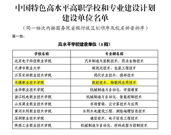 1218日,教育部、财政部发文公布中国特色高水平高职学校和专业建设计划建设单位名单。我校成功入选全国前10名高水平学校建设单位(A档),进入国家双高计划中的第一方阵。