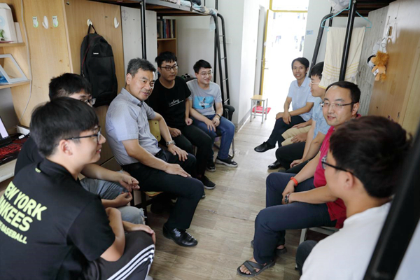 9月19日下午,校党委书记朱爱胜在物联网技术学院党总支书记周陆飞、副书记徐锋、班主任平毅的陪同下走访联系宿舍学生。