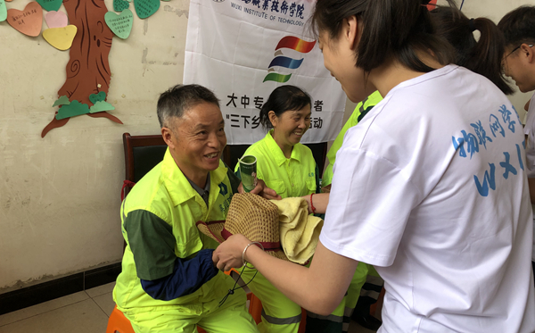最后,“绿踪”小队为环卫工人们献上了防暑的小风扇、草帽、毛巾等爱心物资。三天的暑期实践活动告一段落,但对“马路天使”的尊敬和爱护却会一直延续下去。让我们向辛勤工作的环卫工人学习,向无私奉献的马路天使致敬。