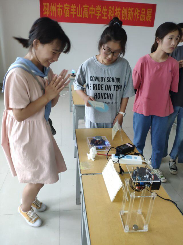 24日下午14:时,宿羊山高级中学有60多名学生来到科技展厅参加交流活动。活动包括写字机器人、机械臂、POVLED、特斯拉线圈、智能小屋、植物云呵护、垃圾分类模拟装置、太阳能追光、平衡小车等20件大学生科技作品,管理E支队志愿者给到场同学详细介绍了科技作品的原理并逐个进行演示。