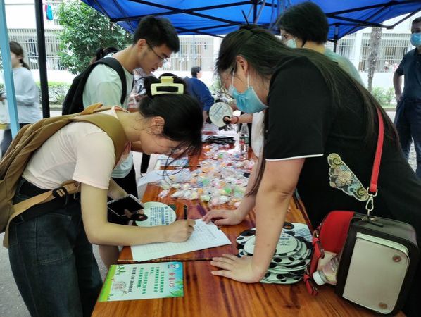 在食堂门前的主干道上,支部党员们热情招呼每一位前来的学生,分发印有本次活动具体安排的小团扇。学生们积极响应,通过学习通扫码参加“知识竞赛”答题,按规则,每位参与的同学都能得到解压神器“捏捏乐”一只,答对7-10题的还可以获得“吉祥兔”一只。