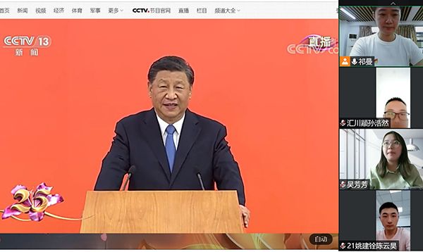 同学们首先观看了习近平总书记在高铁香港西九龙站欢迎仪式上发表讲话的实况直播,深受“一国两制”所取得成就的鼓舞,期待着香港回归25周年这一历史时刻的到来。