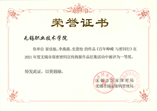日前,无锡市保密局公布了全市保密密码宣传海报征集评选结果,我校设计艺术学院史嘉怡老师指导的作品《百年峥嵘 与密同行》获得一等奖,我校获优秀组织奖。