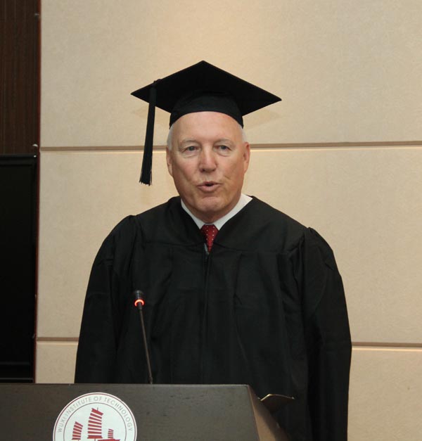 毕业典礼现场气氛热烈,美国皮特社区学院的马西院长、丹·梅奥博士和杰西卡·詹姆士女士,我校领导朱爱胜、戴勇、华坚、冯渊及教务处、国际教育学院、机械技术学院负责人见证了机制11181班毕业生人生中的庄严时刻,机制11281班全体同学也列席观摩了毕业典礼。