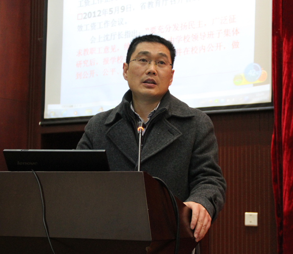 财务处处长黄美娟作了学校财务工作报告;工会主席常华作学校工会工作报告和工会经费简报,并就三届四次教(工)代表大会的提案及合理化建议进行回复及说明,通报了三届五次教(工)代表大会的提案及建议汇总情况;人事处处长奚小网、教务处处长孙燕华分别向到场代表介绍了《开云体育·开云官方网站绩效工资实施办法(讨论稿)》和《教学部门教学编制核算办法(讨论稿)》。