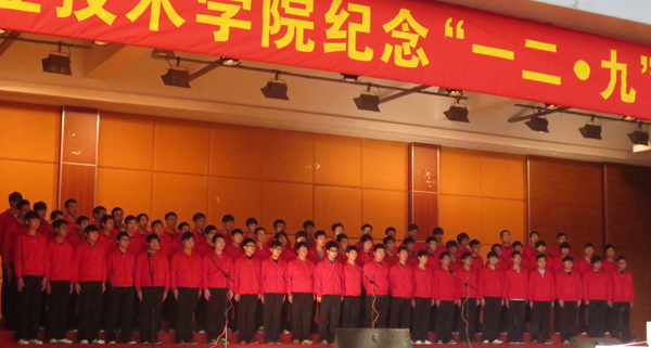 为纪念一二·九学生爱国主义运动,弘扬爱国主义、集体主义精神,激励我校青年师生团结友爱、奋发向上、自强不息、与时俱进的精神,12月10日下午,校团委组织青年师生在学校体育馆二楼隆重举行纪念“一二·九”爱国运动78周年红歌大合唱比赛。学生处副处长吴斌、赵东新以及各分院分团委书记、辅导员老师及800余名学生代表观看了比赛。