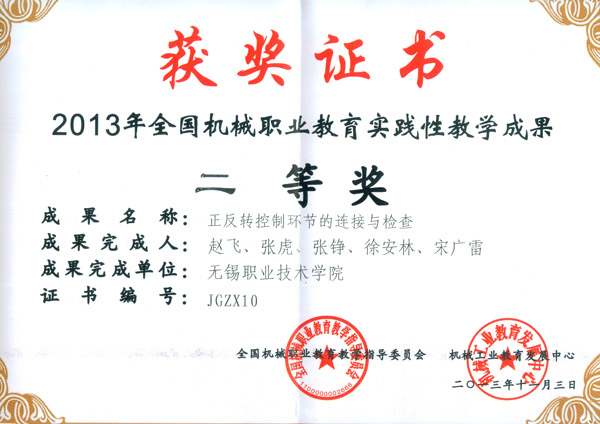 2013年全国机械职业院校实践性教学成果”评审活动于11月3日在浙江机电职业技术学院落下帷幕。我校机械技术学院赵飞、张虎、张铮、徐安林、宋广雷组成的教学团队获得二等奖。