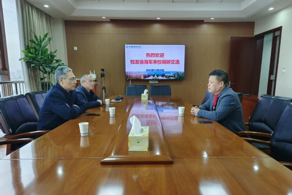 12月26日上午,连云港滴泉食品有限公司销售主管、企管931班校友徐海军返校交流并捐赠物资。校长周桂瑾、副校长强伟纲、校办、校友办有关同志参加座谈。