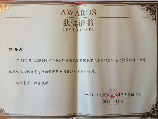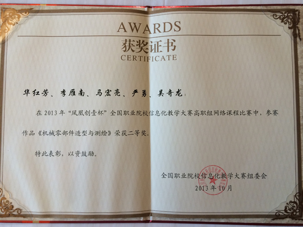 为推动职业院校改革创新教育教学模式,提高教师信息技术应用水平,展示2012年以来全国职业院校信息化教学取得的新成果,10月19日至21日,2013年“凤凰创壹杯”全国职业院校信息化教学大赛决赛在南京举办,我校报送的参赛作品《返回参考点的故障诊断与排除》获得高职组信息化教学设计比赛一等奖,《机械零部件造型与测绘》获得高职组网络课程比赛二等奖。