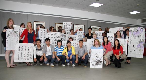 5月30日上午,代表团参观了我校产学合作中心和物联网实训基地,对我校校企合作模式和科技创新成果产生了浓厚的兴趣。合唱团成员分组到我校中美合作项目班级、商务英语班、海外直通车项目班级等的课堂内与学生进行互动交流。下午,代表团来到我校图书馆四楼的艺术共享空间与书画爱好者开展文化沙龙活动,学生为代表团成员现场表演了书画并赠送了部分作品;图书馆王继红老师现场教授美国客人制作丝网花,合唱团成员们热情参与,拿着自己的作品爱不释手。晚上,合唱团受邀参加我校第十六届五四科技文化艺术节文艺晚会并上台表演了两首无伴奏演唱,给晚会增添了多元文化的意境。