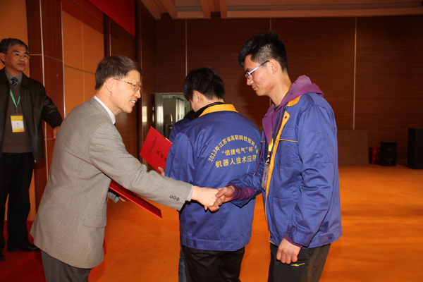 赛项闭幕式上,裁判长李春光对整个赛程进行了总结,对获奖代表队表示祝贺,也勉励各参代表队赛后认真总结,以取得更大的进步。赛项领导小组组长戴勇教授宣布了比赛结果,常州轻工职业技术学院、淮安信息职业技术学院获得二等奖;南通职业大学、徐州工业职业技术学院和南京工业职业技术学院获得三等奖。信捷电气董事长李新、我校戴勇校长和华坚副校长为获奖选手颁发了获奖证书和奖金。