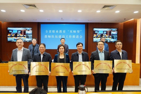 会议宣布成立江苏省职业教育“双师型”教师队伍建设指导中心和江苏省职业教育“双师型”教师认定工作专家委员会,周桂瑾受聘江苏省职业教育“双师型”教师认定工作专家委员会委员,会议为江苏省职业教育“双师型”教师团队12个协作组授牌,我校当选江苏省职业教育“双师型”教师团队装备制造教学创新协作组组长单位。