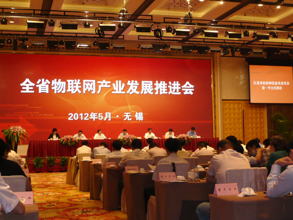 无锡市市长朱克江致欢迎词,工信部副部长杨学山、省经信委主任徐一平、无锡市市长朱克江,市经信委、各市区经信局相关领导以及全省物联网企业代表参加了会议。省经信委徐一平主任介绍了2011年江苏省物联网产业的情况,并对2012年江苏物联网产业的重点工作提出了目标与要求。省经信委还与无锡市人民政府签订了《共同推动无锡市智慧城市建设的合作协议》。会上对首批35个江苏省物联网应用示范项目建设单位14家代表和首批物联网产业基地代表进行授牌,6家单位进行了交流发言,