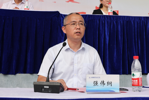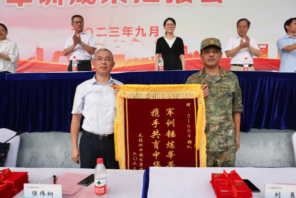 强伟纲副校长代表学校向承训部队赠送锦旗,并作总结讲话。他代表学校向圆满完成本次军训任务的新生同学表示热烈的祝贺,向恪尽职守的承训部队教官、老师们表示衷心的感谢。他深情寄语2023级新生,要厚植家国情怀,将“青春小我”融入“时代大我”,以理想照亮前程,做“眼中有光”的新时代青年;要坚持脚踏实地,以青春奋斗成就个人梦想,以奋斗书写答卷,做“脚下有路”的新时代青年;要加强实践锻炼,以本领彰显担当,做“肩上有责”的新时代青年;要锤炼道德修养,以品行展示风采,做“心中有德”的新时代青年。
