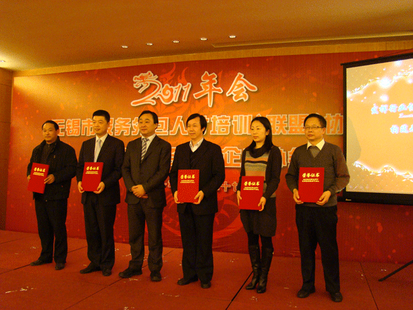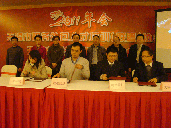 会后还举办了市服务外包企业协会、人才培训联盟2011年年会。市国际商务服务中心主任、企业协会和培训联盟副秘书长徐瑞兰通报了两协会年度工作及财务情况;市商务局服务外包处处长、企业协会和培训联盟秘书长施忠宣读了有关两协会领导变更的决议。本次年会还举行了“校企人才合作重点项目”签约仪式。我校与无锡海辉软件有限公司、萨孚凯信息系统(无锡)有限公司、无锡远迈信息技术有限公司等服务外包重点企业签署了校企合作人才培养协议。