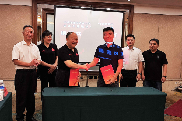 为深入贯彻习近平总书记“多党合作要有新气象、思想共识要有新提高、履职尽责要有新作为、参政党要有新面貌”的总要求,探索新时代新形势下统一战线多党合作新模式、新方法,9月15日,校民革支部和中共无锡市老体协支部隆重举办支部共建活动暨签约仪式。校党委委员、组织部部长、统战部部长朱翔,江苏省老年人体育协会副会长、无锡市老年人体育协会会长陈荣庆,无锡市老年人体育协会副会长龚清荣、黄惠萍、王向群、赵立萍、王春华等到会祝贺并讲话。