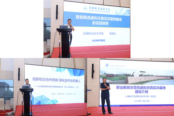 上海电子信息职业技术学院胡国胜教授做“职业教育示范性虚拟仿真实训基地建设介绍”专题汇报,对学校虚拟仿真实训基地建设、课程资源开发、技术创新应用等工作进行了简要介绍,并就后续建设过程与在座院校进行了探讨。