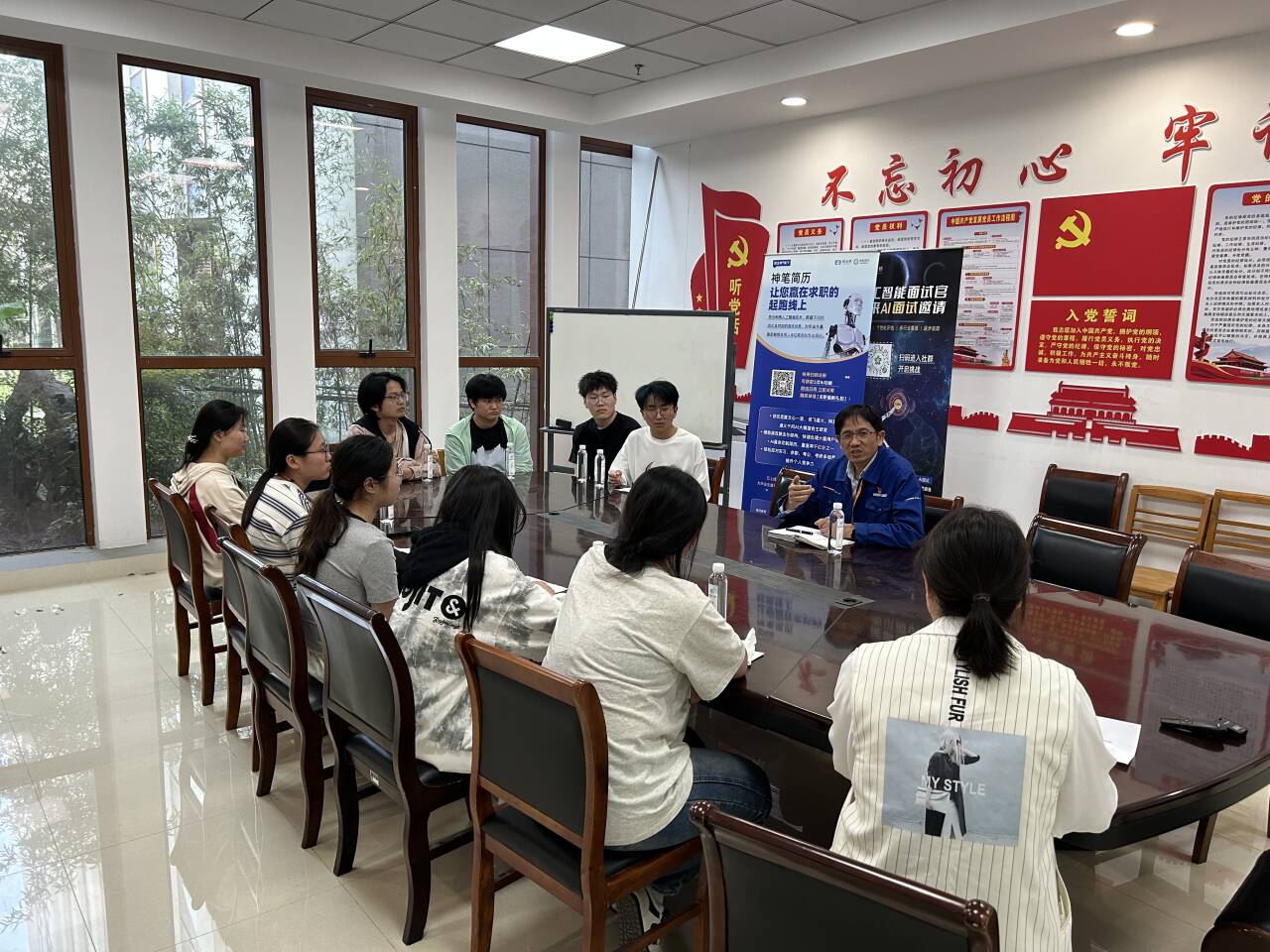 宣讲会结束,同学们意犹未尽,与倪德学劳模进行了深度访谈,围绕劳动报酬和付出的关系、如何度过职业倦怠期、重复劳动有没有成就感等提出自己的疑问,倪德学一一做出回应。他讲述了亲手改良生产线、改良精密设备零部件的过程带来的成就感,介绍如何在重复性工作中坚持创新:“每一个0.01毫米的精进,都是对劳动价值的诠释”。他阐明职业倦怠大多来自瓶颈束缚,不断学习、突破是打破倦怠期的最好方法,并教导同学们在以后的工作中不要斤斤计较,先集中精力把事情做好,报酬和机遇自然随之而来。