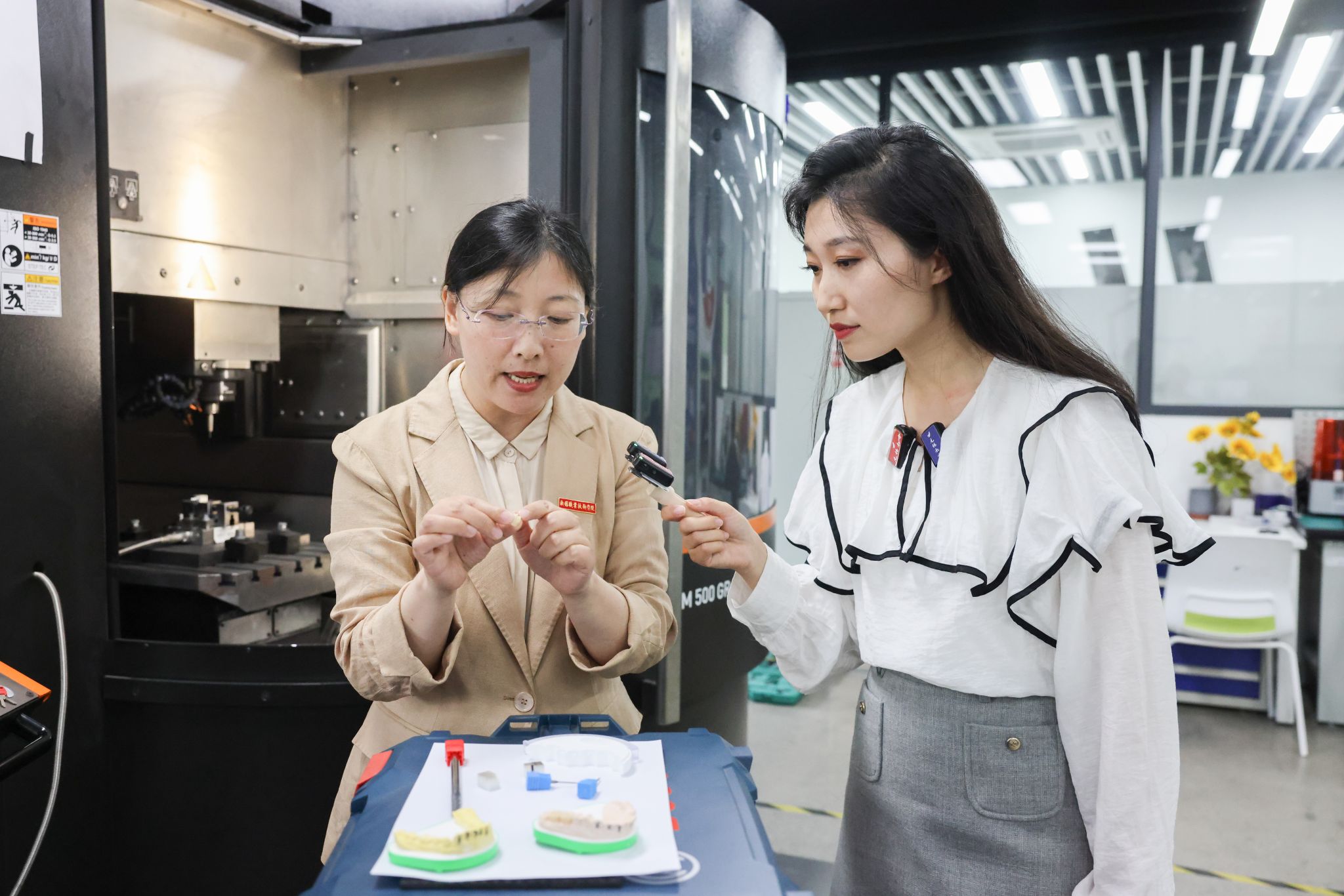 直播由机械工程学院专业教师万安然开场,向网友们分享了自己在锡职求学与回到母校任教的经历,讲述了学校办学条件和硬件环境的变化。随后,职教体验官、无锡教育电视台主持人葛嘉岑带领网友们先后走进增材制造工艺装备与先进应用实验室、难加工材料切削技术与装备研究实验室、公共虚拟仿真实训中心和基础课部物理实验室,了解3D打印、难加工材料在工业生产、航空航天以及日常生活中的应用,以及数字孪生、裸眼3D技术在专业教学中如何发挥作用。