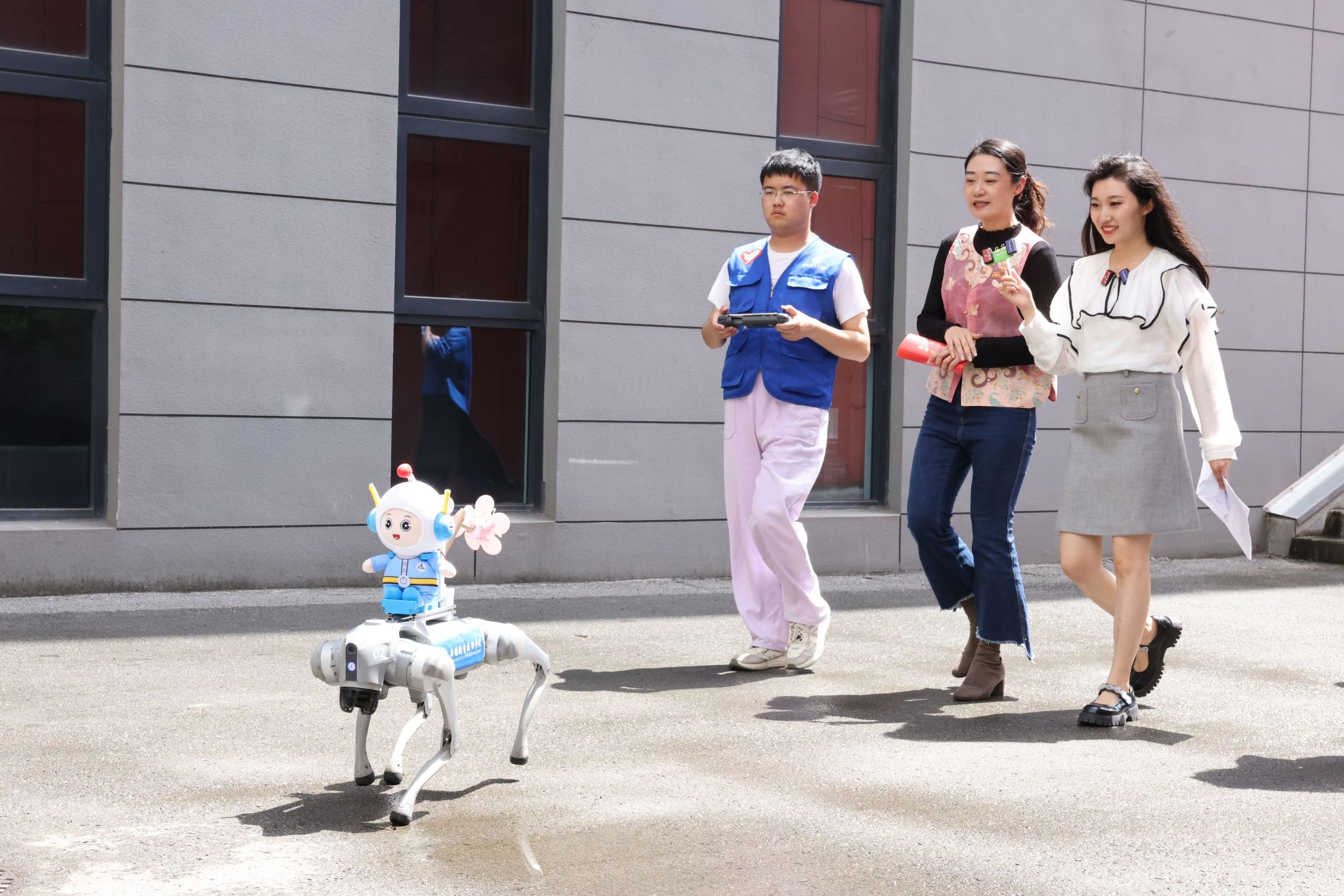 直播过程中还展示了物理制作周科技创新小作品,同学们有的在观察日常生活时获得灵感,设计动作感应小车,希望帮助到行动不便的残障人士;有的在课后与老师们交流时获得启发,制作了交互式小机器人,增进人际交流;有的则就地取材,利用其他同学剩下的各种材质,拼装了拥有夹臂、可以循迹和红外避障的小车……途中偶遇的机器狗“笨笨”和返校参与“信仰公开课”活动的校友陈虎,为整场直播掀起了小高潮。
