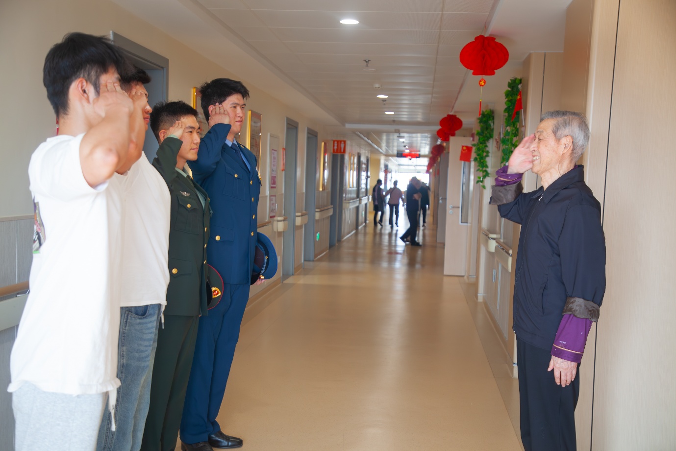 贾司令是一位有着丰富戎马生涯的老战士,他的故事激励着在场的每一位年轻人。在探望过程中,贾司令精神矍铄,他向大家讲述往事,回忆起以往的艰苦岁月以及自己光荣负伤、荣获三等功的经历。他的故事让在场的每一位学生都深刻感受到了革命先辈们不畏艰难、勇于牺牲的伟大精神。贾司令的话语中透露出对国家和人民的深厚情感,以及对职责的无限忠诚。互动环节中,退役士兵小曾提问“老首长,您印象最深的哪件事?”“在一次战斗中,敌机轰炸时,把我炸到了一个坑里,生死关头,是战友们不顾危险,将昏迷的我从土坑中扒出。”学生小齐追问新时代青年的使命,老人语重心长地说“我们流血流汗拼搏奋战,就是为了下一代能过上好日子,祖国的未来,就在你们年轻人身上!”