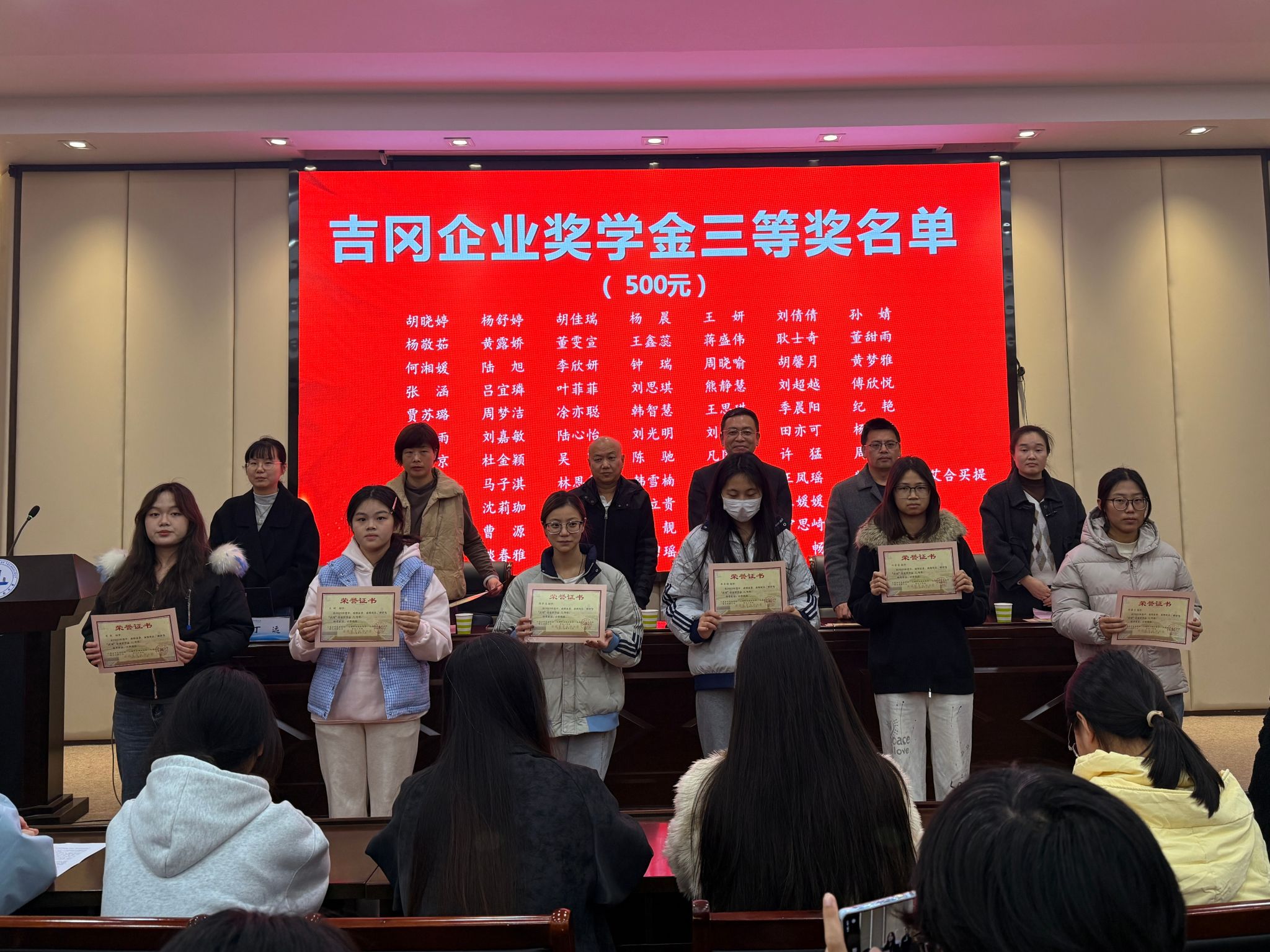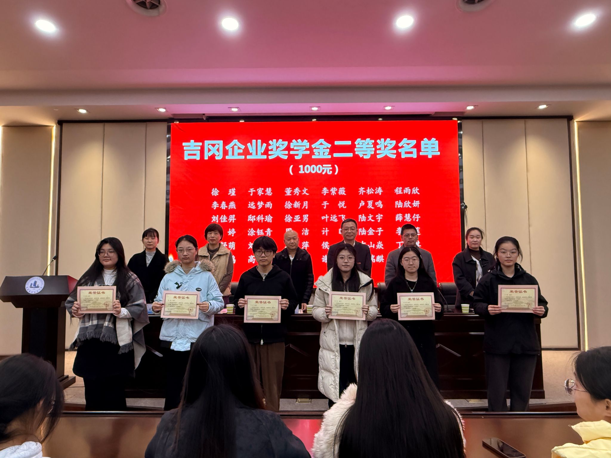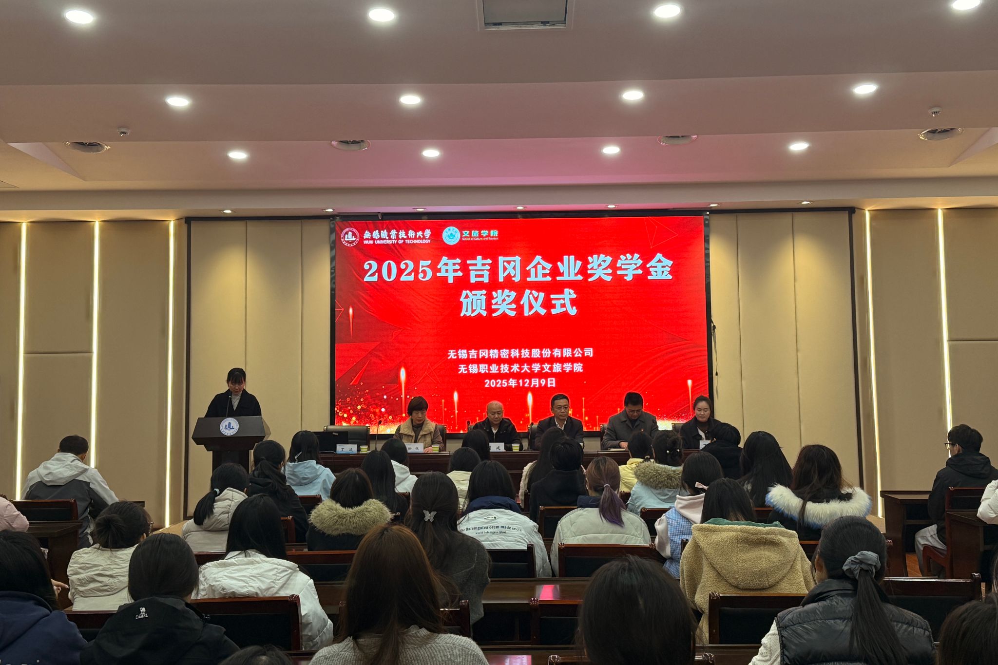 12月9日下午,学校吉冈企业奖学金颁奖仪式在国际交流中心第二报告厅举行。无锡吉冈精密科技股份有限公司董事长周延、人事行政课长丁称称,我校副校长储开峰、学生处处长徐悦、文旅学院党总支书记吴乃鑫,全校各专业获奖学生代表、师生代表共100余人参与活动。仪式由文旅学院党总支副书记丁远主持。
