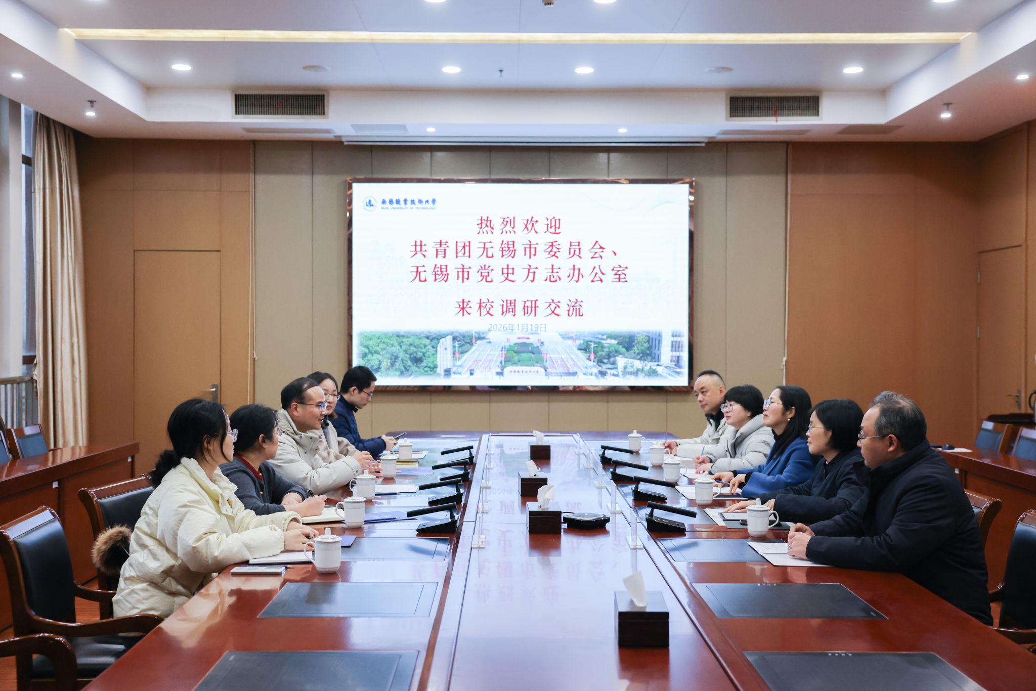 为进一步推进青年大学生革命传统文化教育,强化思想政治引领工作,1月19日下午,共青团无锡市委员会副书记胡海龙、无锡市党史方志办公室副主任郑姣一行来校调研。党委副书记杨雪琴接待了来访嘉宾,宣传部、团委、设计艺术学院相关负责人及教师代表陪同调研。