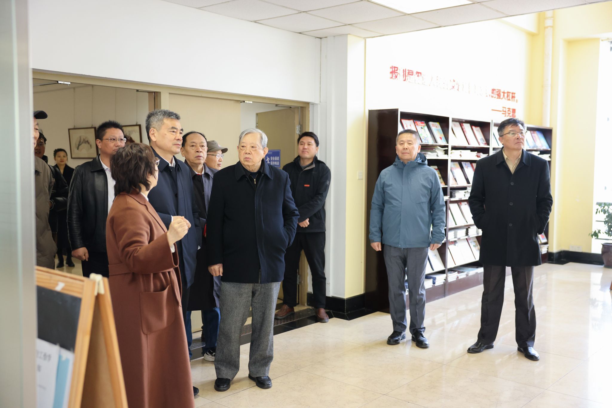调研组先后前往图书馆三楼承泽书院与设计艺术学院展开实地走访。承泽书苑的图书、书架及字画均来自社会各界人士的捐赠,其中图书主要为储江、施平、陈德钧等革命前辈的遗藏,以及无锡市新四军研究会的捐赠。承泽书苑时刻提醒着每一位师生:这里的资源凝聚着社会各界尤其是革命前辈们的深沉恩泽。在设计艺术学院,调研组参观了学生红色主题作品展。展览聚焦无锡新四军纪念场馆中的抗战文化资源,深入挖掘其中的典型人物与事件,以青春视角为切入点,运用专业的艺术设计语言与创作理念,设计开发出红色绘本、红色动画、红色文创等艺术作品。同时,展览借助VR、AR、MR、AI等前沿技术,将场馆中的红色故事转化为青年大学生可感知、可参与、可学习、可传播的视觉文本,激励新时代大学生在铭记历史中赓续红色血脉,在砥砺前行中勇担时代使命,让跨越时空的抗战精神薪火相传。调研组对学校紧扣职业院校特色,打造专属关工阵地、推动工作下沉一线、贴近学生的务实做法给予了肯定。