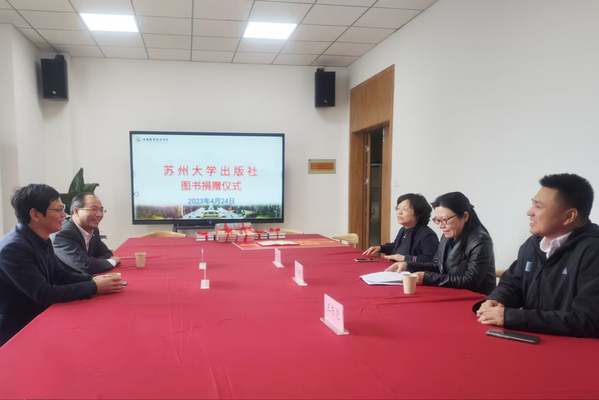 4月24日,苏州大学出版社图书捐赠仪式在我校图书馆举行,苏州大学出版社总编辑陈兴昌、副社长朱绍昌,我校副校长吴慧媛、图书馆馆长韩冰、副馆长王东亮出席捐赠仪式。