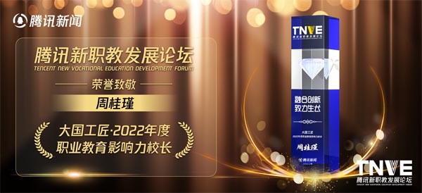 12月29日,由腾讯新闻主办、启航智诚承办的2022腾讯新职教发展论坛于云端举办,我校校长周桂瑾受邀参与2022腾讯新职教发展论坛,并发表题为《以专业建设为龙头 以技术创新为突破,创新产教融合机制》的主旨演讲,并获得“大国工匠·2022年度职业教育影响力校长”专项致敬。