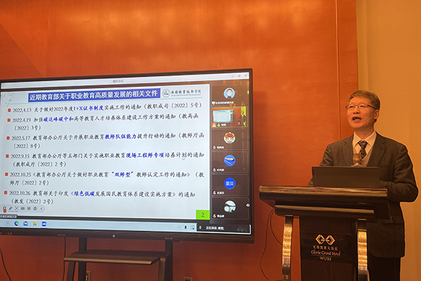 戴勇就职业教育质量评估和绿色双碳工作相关思考作专题报告,标准研究所副所长兼秘书长、我校张铮教授就标准所前期项目开展情况和后期工作要求作专题报告。四川工程职业技术学院副院长向守兵教授和安徽机电职业技术学院周明龙教授分别对“机械行业职业院校基层教育教学管理专家评选标准”和“机械行业百件高级教具作品竞赛标准”的项目启动情况作专题汇报。会议还邀请了江苏省电器工业协会副秘书长陆育青就苏州市及电力系统的绿色双碳工作情况,作《绿色制造的相关背景和现有政策》专家报告。
