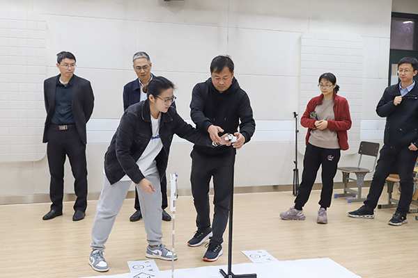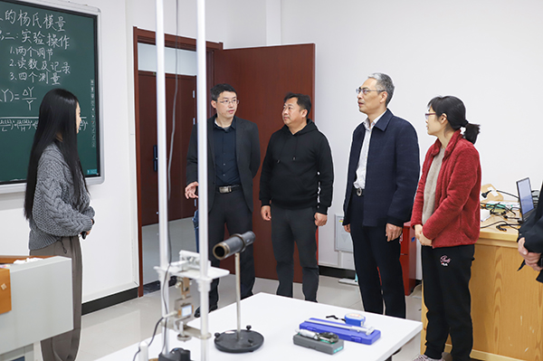 校领导一行详细了解了团队的备战情况,仔细询问了备战过程中遇到的问题与困难,对基础课部的备战工作给予充分肯定,对参赛师生的拼搏精神给予高度评价。现场还观看了命题类创新作品制作 “循声觅迹”组及大学生物理实验讲课比赛“授业解惑”组的模拟答辩,并给予了进一步的指导。