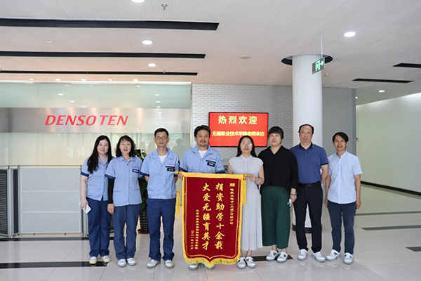 杨雪琴代表学校向电装天电子(无锡)有限公司赠送了锦旗,并与公司签署了新一轮为期五年的“电装天奖学金”基金协议。随后,我校一行还参观了公司产线,了解了公司的装备技术情况。