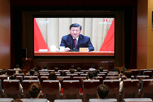 观看主会场设在学校综合楼一楼报告厅,校党委委员、副校长杨雪琴、青年教师代表、在校团委委员,各二级学院分团委委员以及基层团支部优秀团员代表等共计50余人现场观看。各二级学院团总支、直属团支部也积极组织团员青年在宿舍观看。