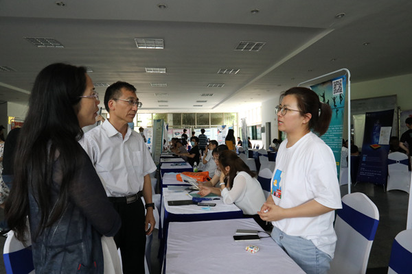 天气的炎热并没有阻挡求职者与用人单位的热情,下午1点半左右,用人单位陆续进入会场,毕业生也已经在门口驻足寻找心仪的企业。会场内秩序井然,有三五成群的毕业生站在展位前,仔细研读企业招聘信息,结合用人单位的需求筛选适合自己的岗位。招聘会当天,校领导、学生工作处相关负责人等到现场了解招聘情况,与多家招聘企业和毕业生亲切交谈。