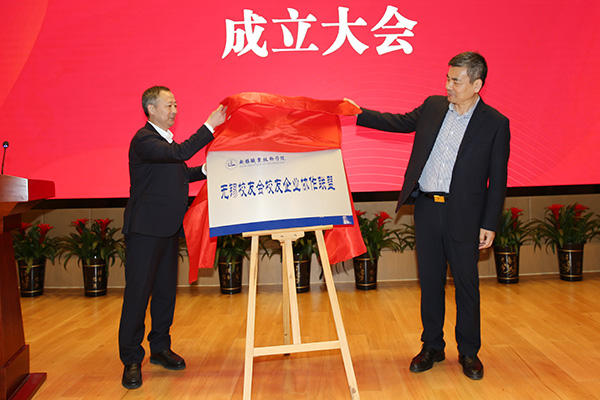 无锡校友会会长沈剑标(左)与我校朱爱胜书记共同为联盟揭牌