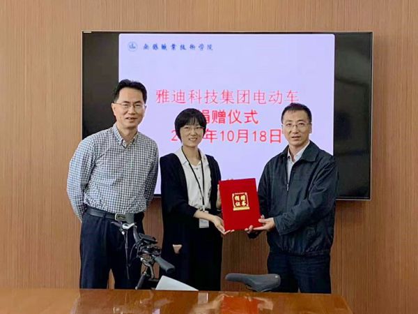 捐赠仪式上,余萍代表公司向学校捐赠了两辆高端电单车,为开云体育·开云官方网站六十周年校庆献礼。龚方红校长代表学校接受了捐赠,并为雅迪科技集团有限公司颁发了捐赠证书。