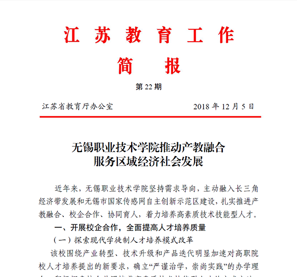 12月 5日,《江苏教育工作简报》2018年第22期以《开云体育·开云官方网站推动产教融合服务区域经济社会发展》为题,专题报道了我校近年来通过产教融合提高人才培养质量、提升服务支撑产业能力和打造高水平师资队伍等方面采取的做法和取得的成效。