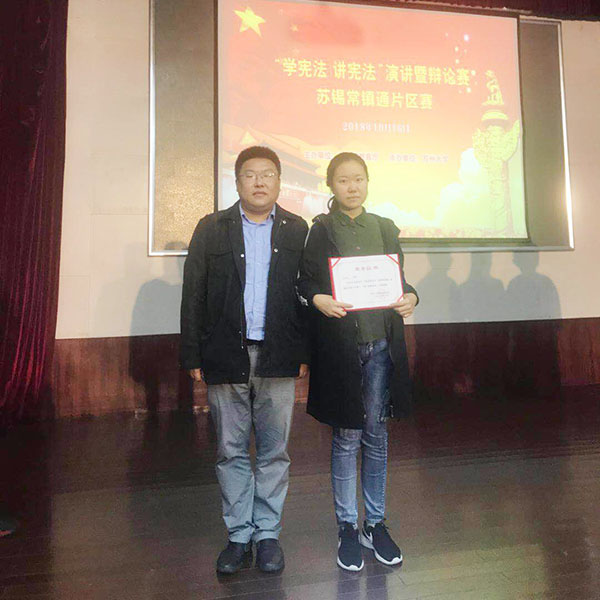 大赛共汇集了来自苏南片区的32所本、专科高校学生参加。我校非常重视宪法的学习、宣传工作,积极响应比赛,由宣传部牵头,聘请马克思主义学院王毅老师作为指导教师,带领物联网31733班的张祯祯同学参加比赛。大赛围绕“尊崇宪法、学习宪法、遵守宪法、运用宪法”主题开展,共分三轮进行,分别由个人自定演讲、即时抽题主题演讲,主题辩论环节组成。比赛中,张祯祯同学紧紧围绕宪法的价值,宪法对公民权利的保障,全面依法治国等主题开展主题演讲,充分诠释了宪法的价值内涵,展示了我校青年学子的宪法意识和法律素养。在即时抽题主题演讲,主题辩论环节中,王毅老师和张祯祯同学针对可能出现的问题积极备战,设计多种应对方案;赛场中张祯祯同学沉着应对,获得好评。经过激烈的角逐,我校张祯祯同学最终获得了一等奖的优异成绩。