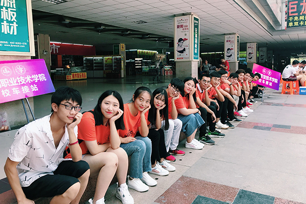 提前等候在车站的学生志愿者们