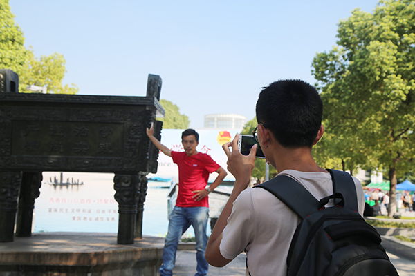 新生与家长在校庆纪念鼎留影