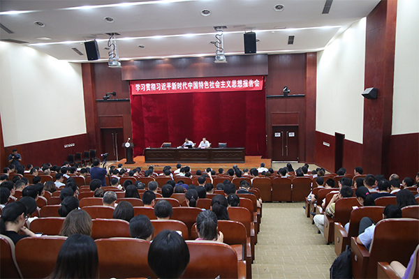 王刚院长从习近平新时代中国特色社会主义思想的产生条件、习近平新时代中国特色社会主义思想的逻辑体系和习近平新时代中国特色社会主义思想的价值意蕴三方面进行了深入解读,重点对“新时代的内涵”、“八个明确”、“十四个坚持”等方面做了科学系统、深入浅出地阐释。整个报告会鸦雀无声,与会人员聚精会神地听取报告,会场洋溢着浓厚的理论学习氛围。王院长的报告使全体与会人员开阔了视野,拓宽了思路,对进一步认真贯彻落实习近平新时代中国特色社会主义思想和党的十九大精神,推动学校高质量发展提供了有效的借鉴和指导。