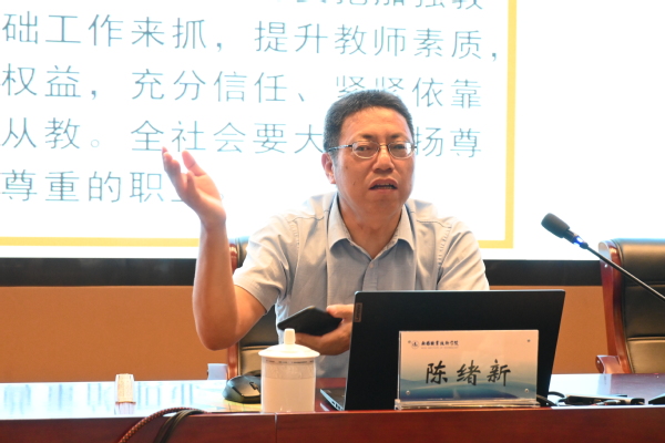 报告会上,陈绪新围绕“弘扬教育家精神,争做时代大先生主题”,从十项准则、平语近人、教育家精神、时代大先生四个方面,以生动的语言、新颖的观点、鲜活的案例,剖析了教育家精神的内涵价值和实践要求,分享了在教育实践中从“大视野、大智慧、大学问、大格局、大德行、大境界”六个方面着手争做大先生的经验和感悟,为与会人员进行了深入浅出、精彩生动的辅导,为教师如何“以思想的魅力引领人、以知识的魅力摄动人、以人格的魅力熏陶人、以艺术的魅力吸引人、以激情的魅力感化人”带来了深刻启发。