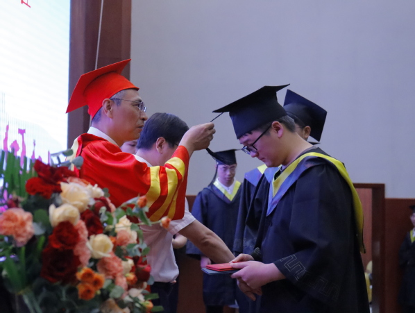周桂瑾和尹必峰为全体现场毕业生颁发毕业证书和学位证书,并行拨穗礼。学位授予仪式结束,奚茂龙副校长衷心祝福每一位同学不负韶华、不负青春、人生出彩!