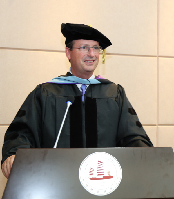 毕业典礼由顾京副校长主持,华坚副校长和丹·梅奥博士分别致辞。在致辞中,华坚副校长对中美两校过去8年的合作给予高度评价,寄语毕业生做一个终身学习的智者。丹·梅奥博士为中美合作办学项目的毕业生们送上了美好祝愿,并对合作项目进行了全面的总结回顾,感谢我校一直以来给予的支持和帮助。华坚副校长和丹·梅奥博士分别为毕业生颁发中美两校证书并佩戴徽章合影留念。同时,华坚副校长授予丹·梅奥博士中美合作办学项目杰出成就奖。