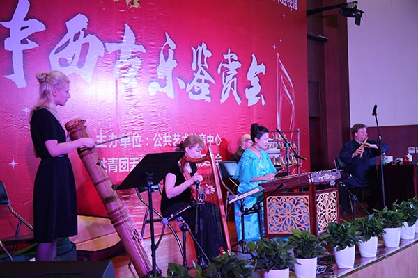 2日下午,FA古乐团的音乐家们还开设了一场音乐艺术讲座,详细介绍并演绎了中世纪笛子、钟琴、竖琴和塔布隆等乐器,并演奏了部分中世纪乐谱。我校民族器乐协会的同学们也上台进行了积极互动,用笛子演奏了中国传统曲目。